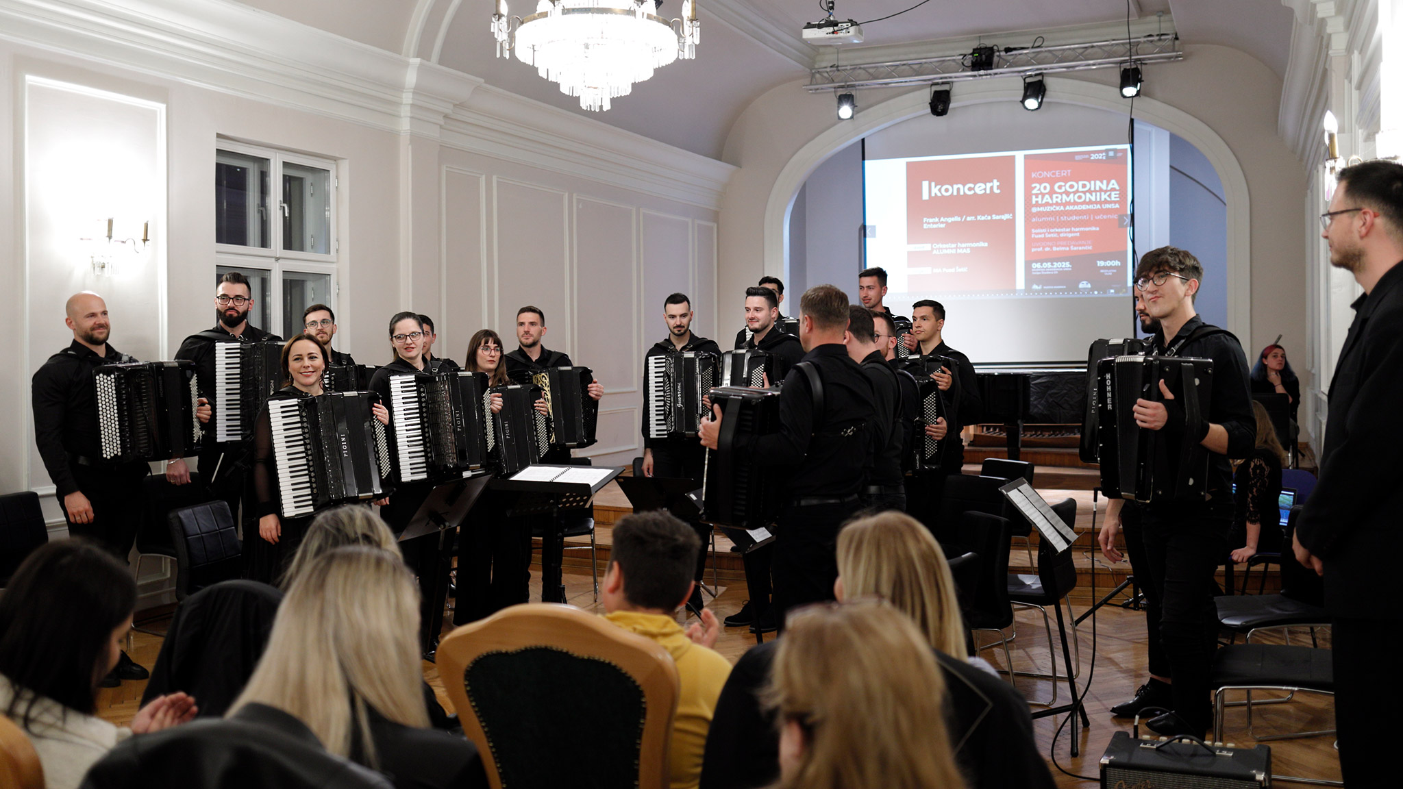 Proslava ovog značajnog jubileja zaokružena je nastupom Orkestra harmonika koji je izveo “Enterier” F. Angelisa u aranžmanu akrodeonistice i kompozitorice Kaća Sarajlić, a zatim i njenu kompoziciju “Fantazija 24”. Kao članovi orkestra, pod dirigentskim vodstvom ass. mr. Fuada Šestića, asistenta na Odsjeku za dirigovanje Muzičke akademije UNSA i dugogodišnjeg saradnika Smjera za harmoniku, nastupili su sadašnji studenti i alumni: Sinan Ajkunić (BA 2013), Anes Čolak (II godina), Armin Džafić (II godina), Iris Granulo (MA 2024), Azmir Halilović (ass. MA 2019), Asmir Hamzić (MA 2022), Alen Hodžić (MA 2012), Vedad Husomanović (III godina), Himzo Karić (BA 2010), Atif Krdžić (III godina), Danijel Lovrić (MA 2020) Hazim Mehmedić (II godina), Mihael Mucko (IV godina), Muharem Osmanagić (BA 2020), Emil Pilica (III godina), Kaća Sarajlić (MA 2017), Tarik Šadić (BA 2013), Raisa Šehu (BA 2011), Safet Tahirović (MA 2024) i Damir Vreva (II godina), ali i Iman Bajramović Hergić (klavijature, IV razred, klasa: prof. Iva Pašić).