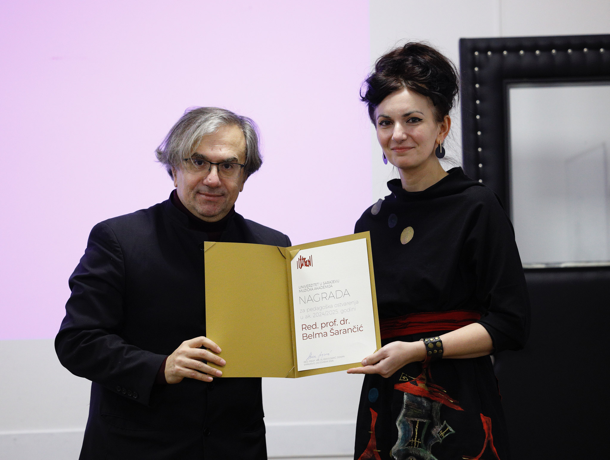 Nakon predstavljanja sadržaja monografije "70 godina Muzičke akademije Univerziteta u Sarajevu", kao svjedočanstva o radu i postignućima ostvarenim u protekloj deceniji (2015–2025), dekan prof. mr. Ališer Sijarić osvrnuo se na uspjehe akademskog osoblja tokom 2025. godine. Istakao je izuzetne rezultate ovogodišnjih dobitnica nagrada Univerziteta u Sarajevu te čestitao asst. dr. Hanan Hadžajlić (Nagrada za poseban doprinos umjetnosti za 2024. godinu), prof. dr. Belmi Alić (Nagrada za višegodišnji doprinos umjetnosti) i prof. dr. Nermi Hodžić-Mulabegović (Nagrada za doprinos u disciplinama od posebnog nacionalnog značaja za 2024. godinu), nakon čega je dodijelio godišnje nagrade Muzičke akademije UNSA.