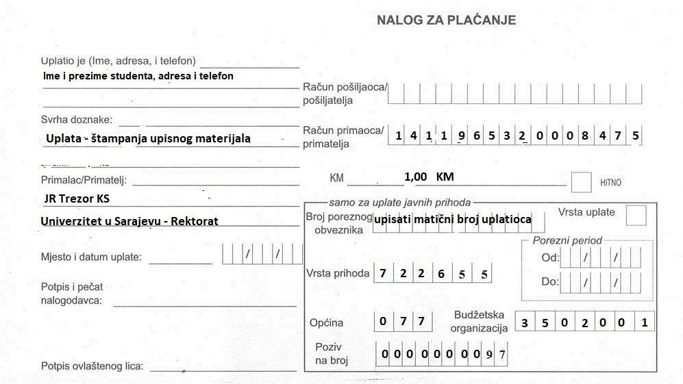 Redovni-samofinansirajući studenti dostavljaju uplatnicu za školarinu, a studenti koji plaćaju ispite uplatnicu za iste.