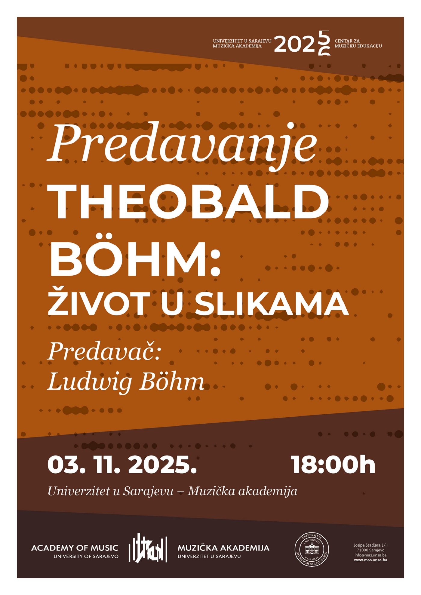 Odsjek za duvačke instrumente i harmoniku – Smjer flauta i Centar za muzičku edukaciju Muzičke akademije Univerziteta u Sarajevu najavljuju predavanje Ludwiga Böhma „Theobald Böhm: život u slikama“. Predavanje će se održati 3. 11. 2025. godine u 18:00 sati na Muzičkoj akademiji Univerziteta u Sarajevu. Namijenjeno je za nastavnike i učenike flaute osnovne muzičke/glazbene škole i srednje muzičke/glazbene škole, kao i za studente Muzičke akademije Univerziteta u Sarajevu.