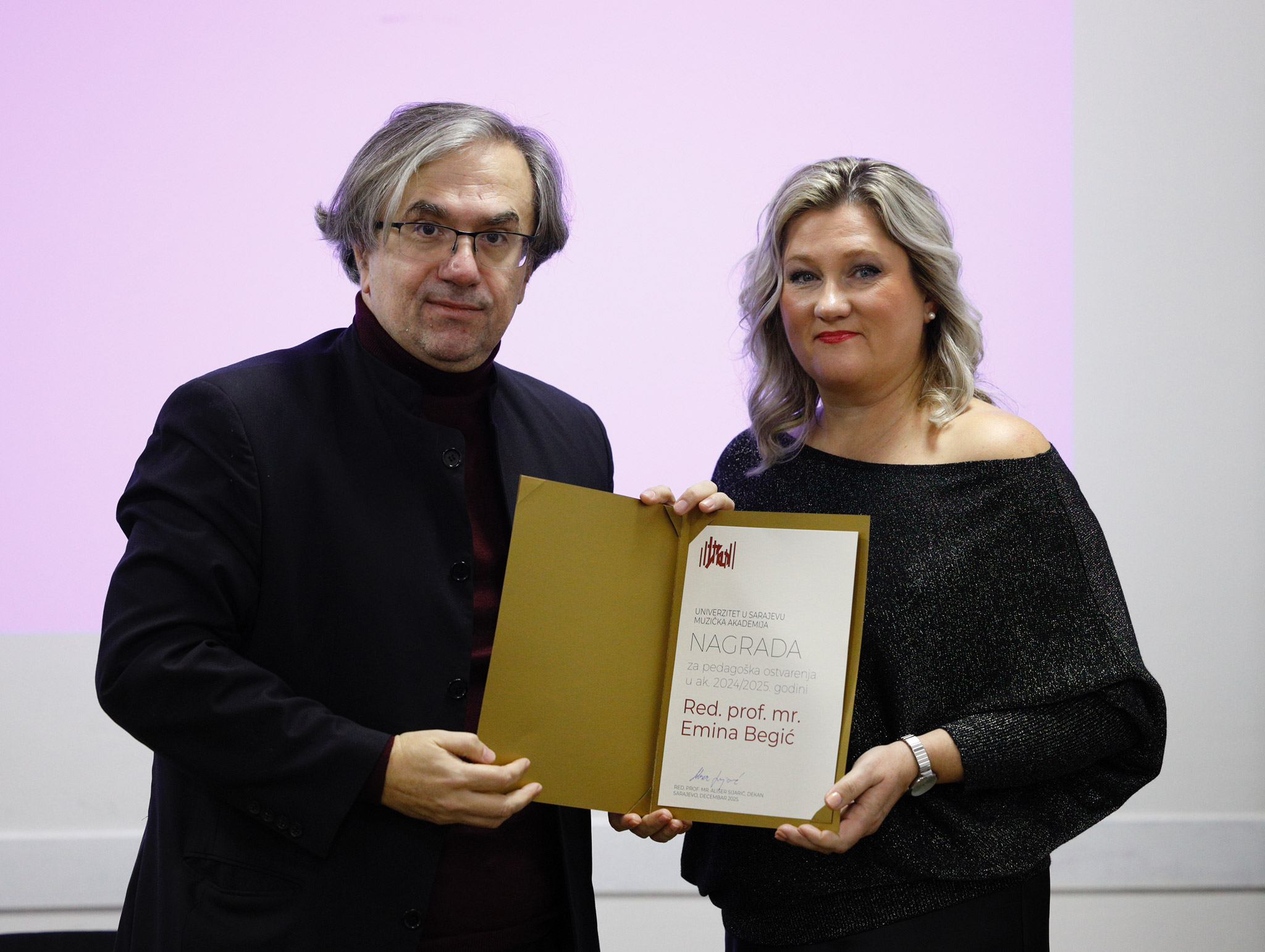 Nakon predstavljanja sadržaja monografije "70 godina Muzičke akademije Univerziteta u Sarajevu", kao svjedočanstva o radu i postignućima ostvarenim u protekloj deceniji (2015–2025), dekan prof. mr. Ališer Sijarić osvrnuo se na uspjehe akademskog osoblja tokom 2025. godine. Istakao je izuzetne rezultate ovogodišnjih dobitnica nagrada Univerziteta u Sarajevu te čestitao asst. dr. Hanan Hadžajlić (Nagrada za poseban doprinos umjetnosti za 2024. godinu), prof. dr. Belmi Alić (Nagrada za višegodišnji doprinos umjetnosti) i prof. dr. Nermi Hodžić-Mulabegović (Nagrada za doprinos u disciplinama od posebnog nacionalnog značaja za 2024. godinu), nakon čega je dodijelio godišnje nagrade Muzičke akademije UNSA.